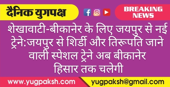 शेखावाटी-बीकानेर के लिए जयपुर से नई ट्रेने:जयपुर से शिर्डी और तिरूपति जाने वाली स्पेशल ट्रेने अब बीकानेर हिसार तक चलेगी