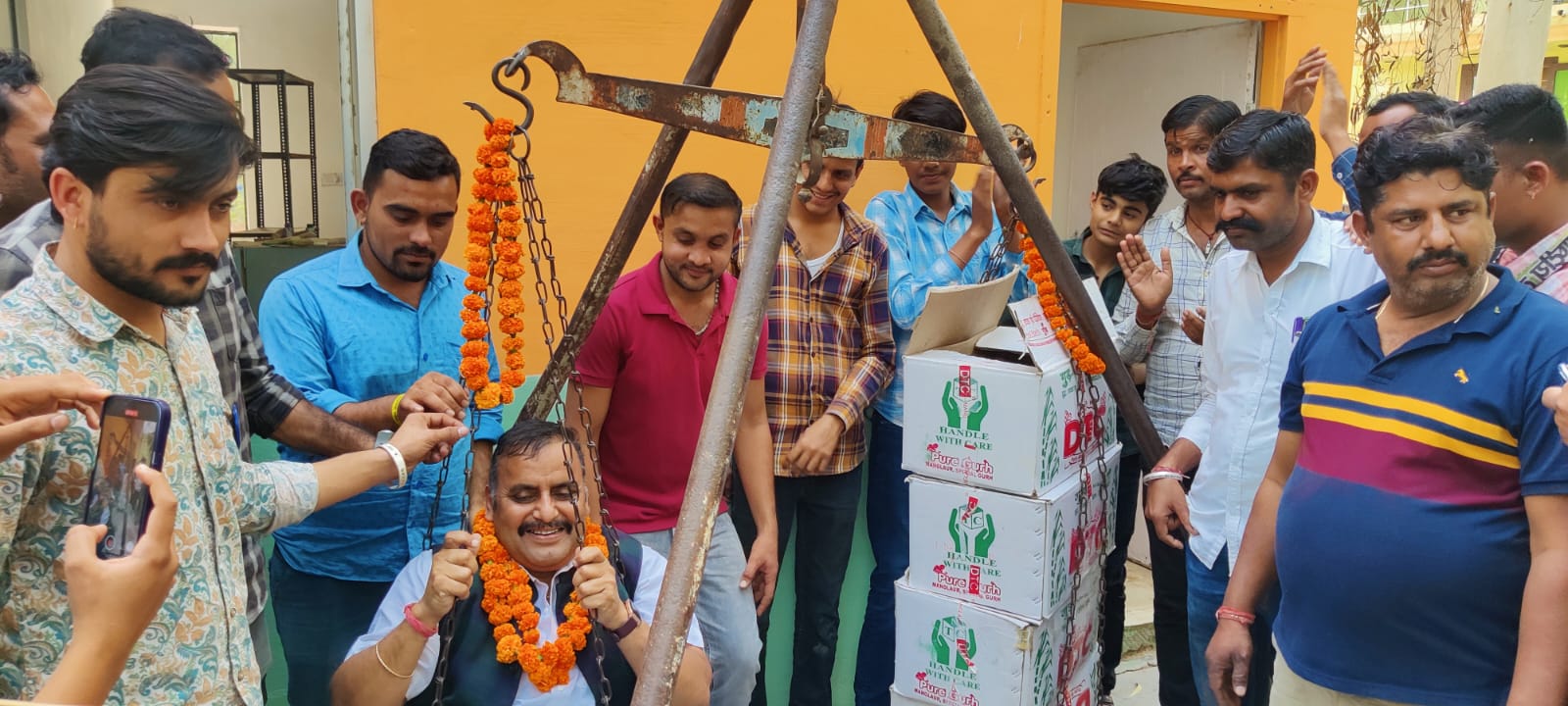 प्रत्याशी बिश्नोई के जनसंपर्क के दौरान लोगों ने गुड़ से तोलकर समर्थन दिया