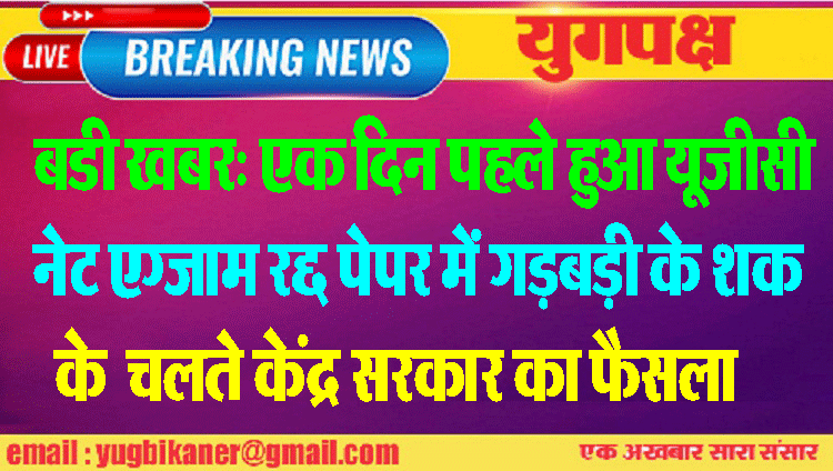 बडी खबर: एक दिन पहले हुआ यूजीसी नेट एग्जाम रद्द पेपर में गड़बड़ी के शक के चलते केंद्र सरकार का फैसला