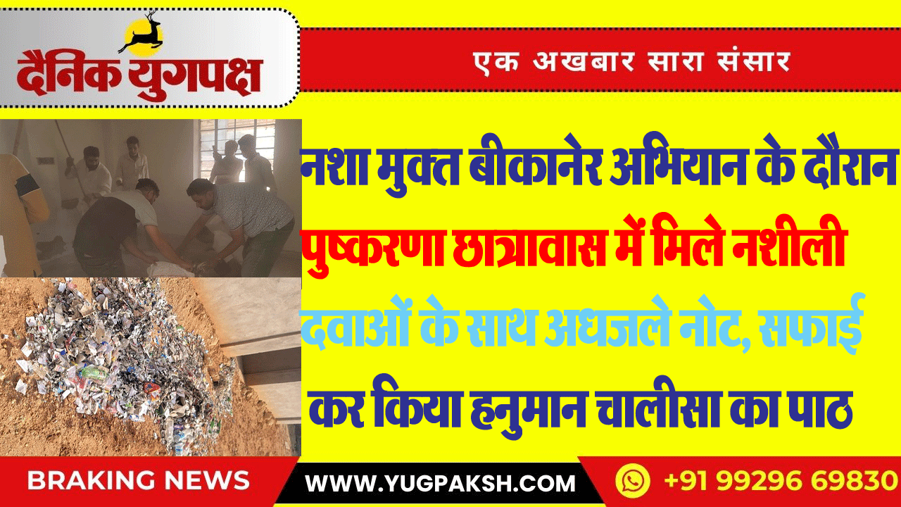 नशा मुक्त बीकानेर अभियान के दौरान पुष्करणा छात्रावास में मिले नशीली दवाओं के साथ अधजले नोट, सफाई कर किया हनुमान चालीसा का पाठ